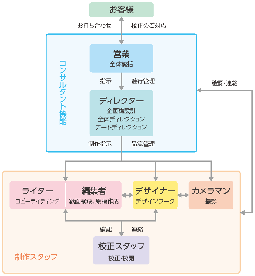 企画・編集・デザインの各工程において、最終的なアウトプット(印刷物やWeb公開)を見据えたディレクションを行います。これにより、制作途中の手戻りを最小限に抑え、高品質と効率的な進行を両立させます。お客様のビジネスを次の一歩に進めるための、本質的なクリエイティブを提供することをお約束します。