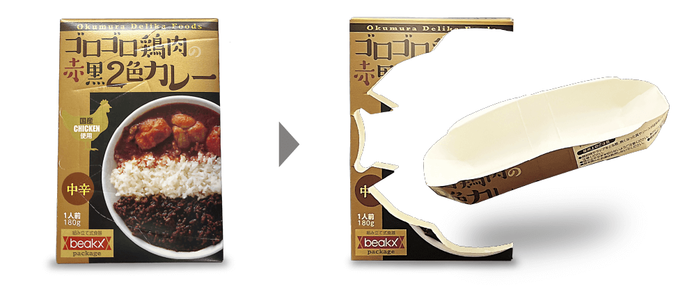 「beakx」は、当社の特許技術である「折り紙食器 beak」を応用した“箱から皿になる”パッケージです。レトルト食品などのパッケージがそのまま洗い物不要の丈夫な食器として機能するため、災害備蓄やアウトドア用途で大きな効果を発揮します。