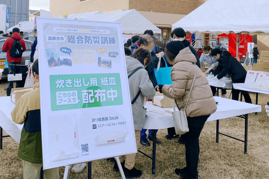 ・炊き出し訓練における「折り紙食器 beak」お皿300食分の提供、来場者による組み立て