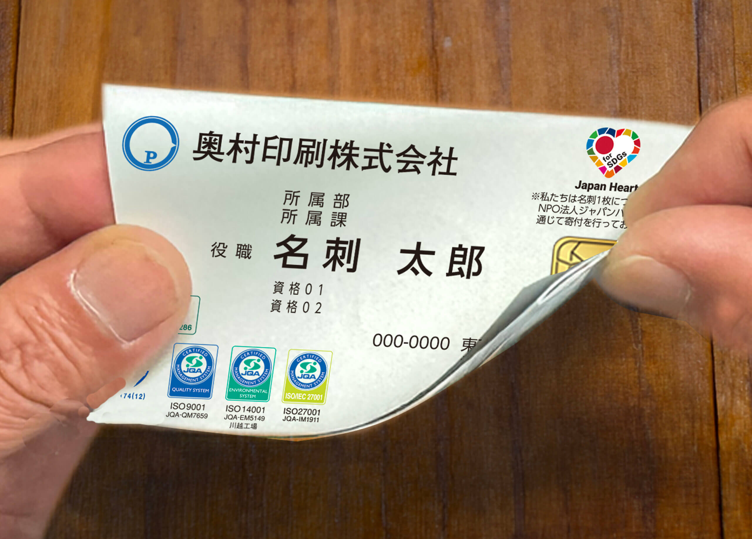 「SmartMeishi」は、当社の特許出願済み技術を応用し、NFCタグを紙で挟んで圧着した独自の構造を採用しております。この構造により、使用後にNFCタグ本体とベースの紙とを容易に分別できるため、紙としてリサイクルすることが可能となり、脱プラスチックと環境負荷の低減に貢献いたします。