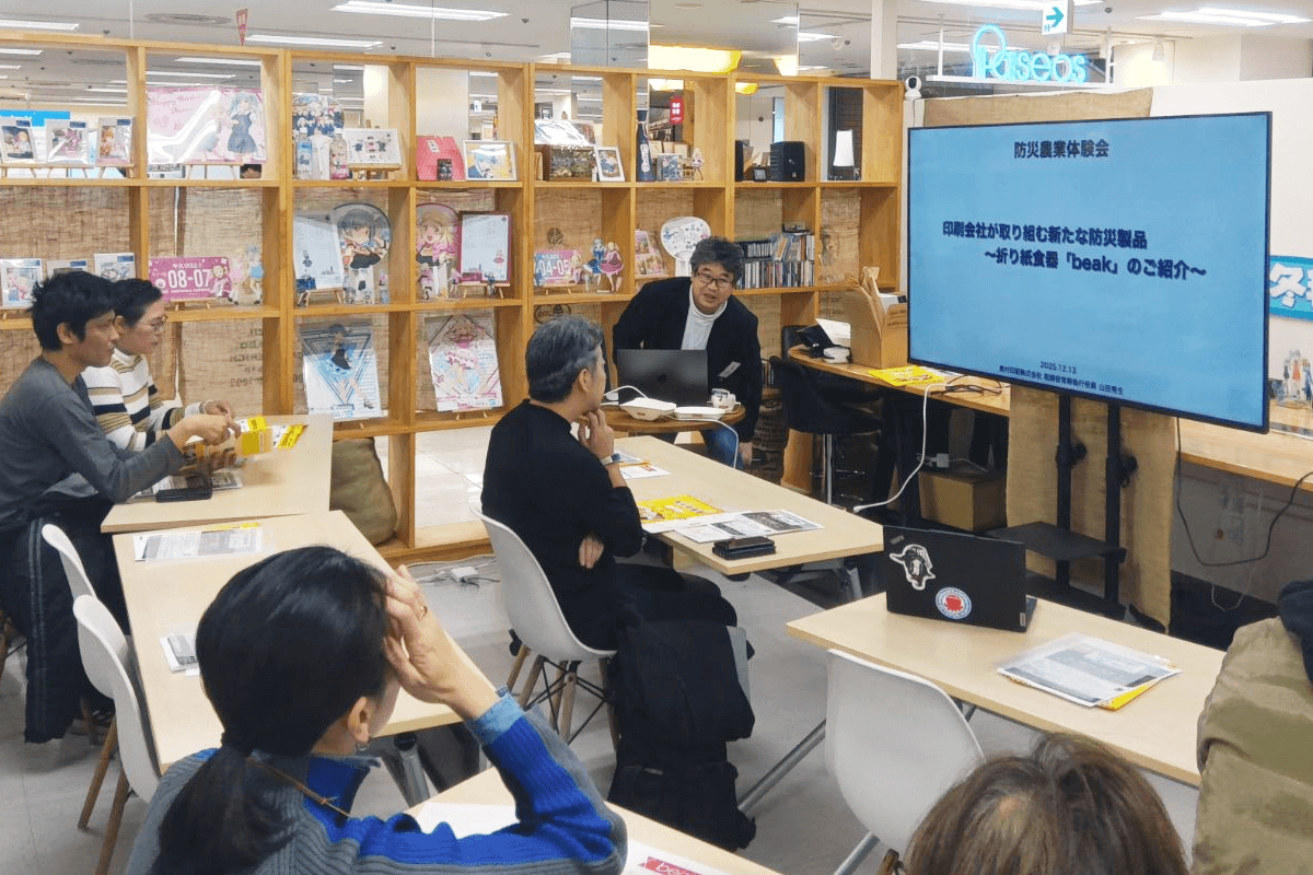 当日のセミナーでは、“印刷から防災を考えた新しいカタチ”をテーマに、beak 誕生の背景や、防災用品としての活用事例、被災地支援での即効性などを紹介。また、紙という身近な素材から生まれたイノベーションが、どのように防災の現場で役立つのかを、多くの参加者の皆様に体験していただきました。ワークショップでは、参加者全員が実際に beak を折り、形になる楽しさと、災害時に“道具を使わずに器を作れる”実用性を体感。「保管がコンパクトで持ち運びも楽」「防災と日常のどちらにも使えるのが良い」など、多くのご意見をいただきました。